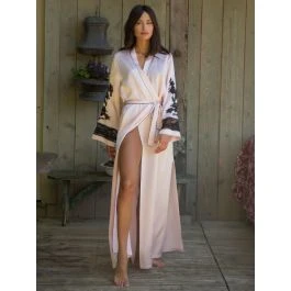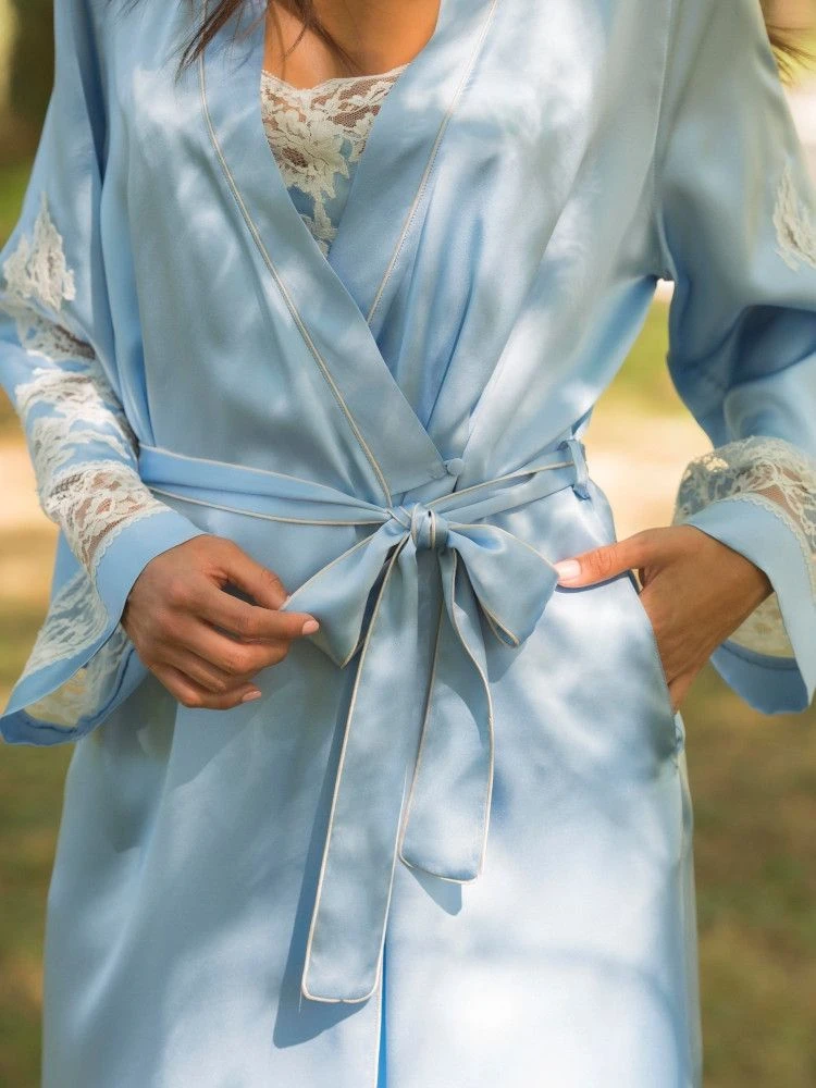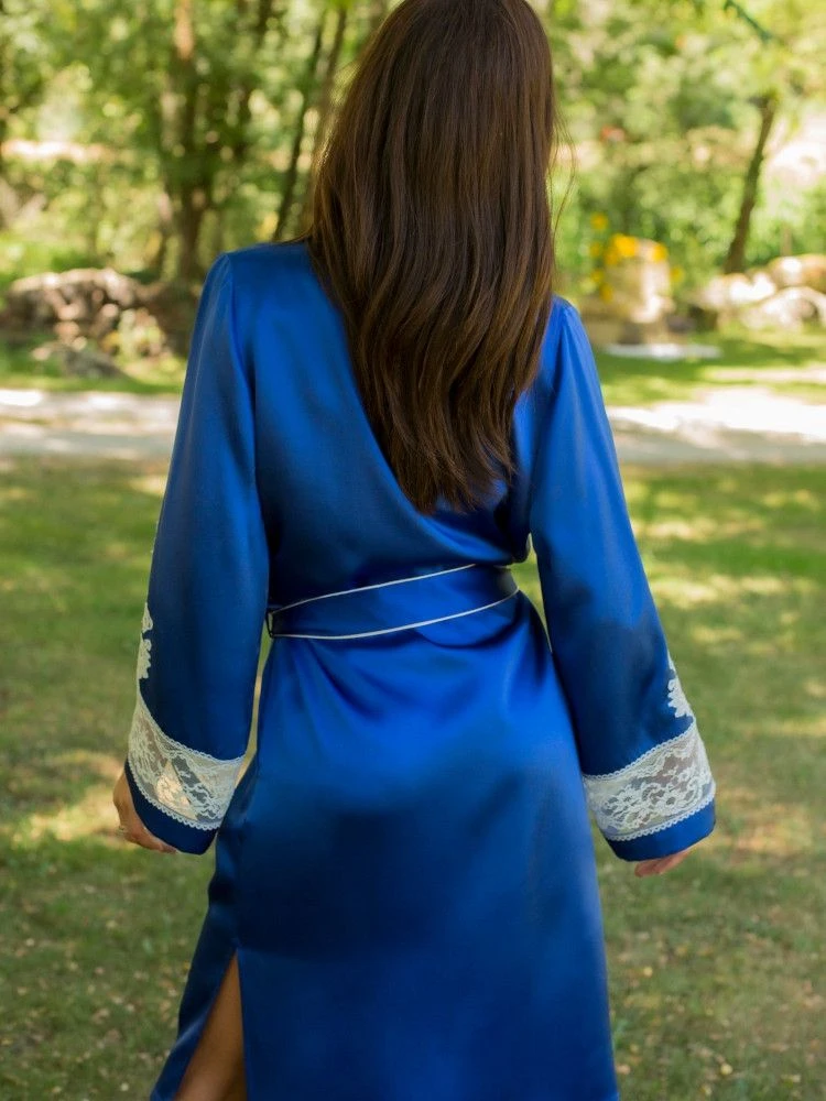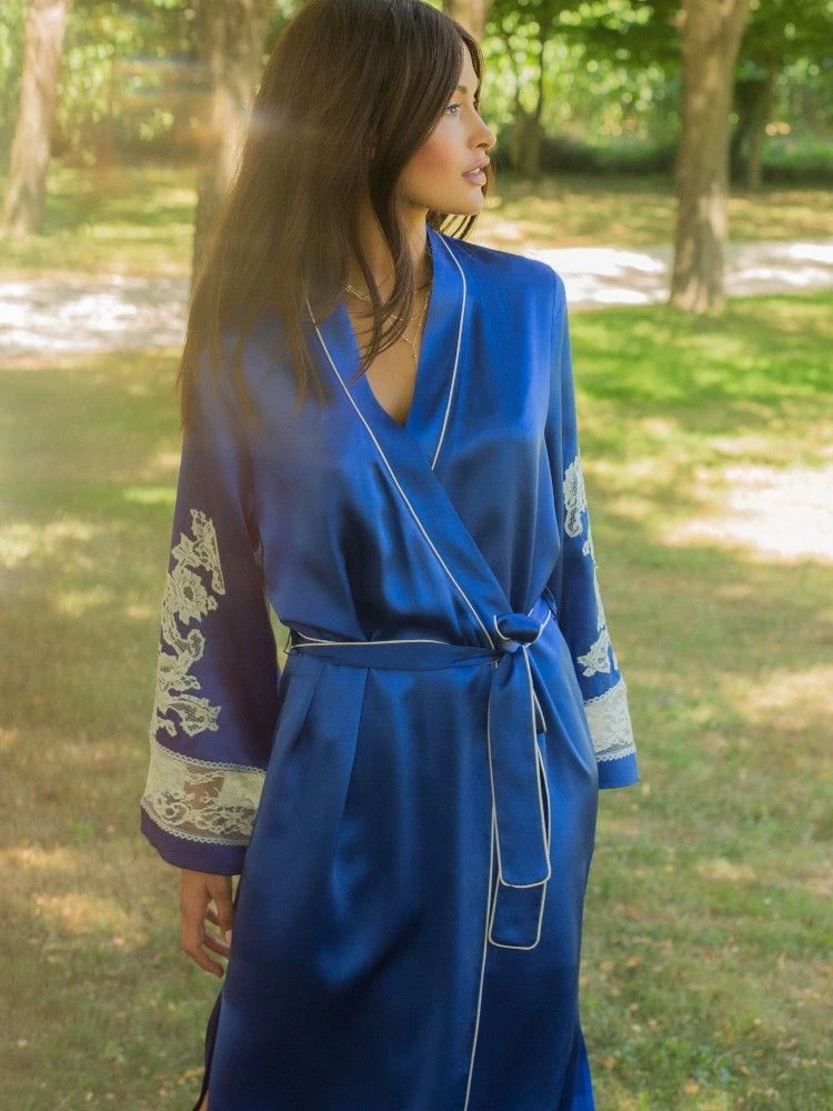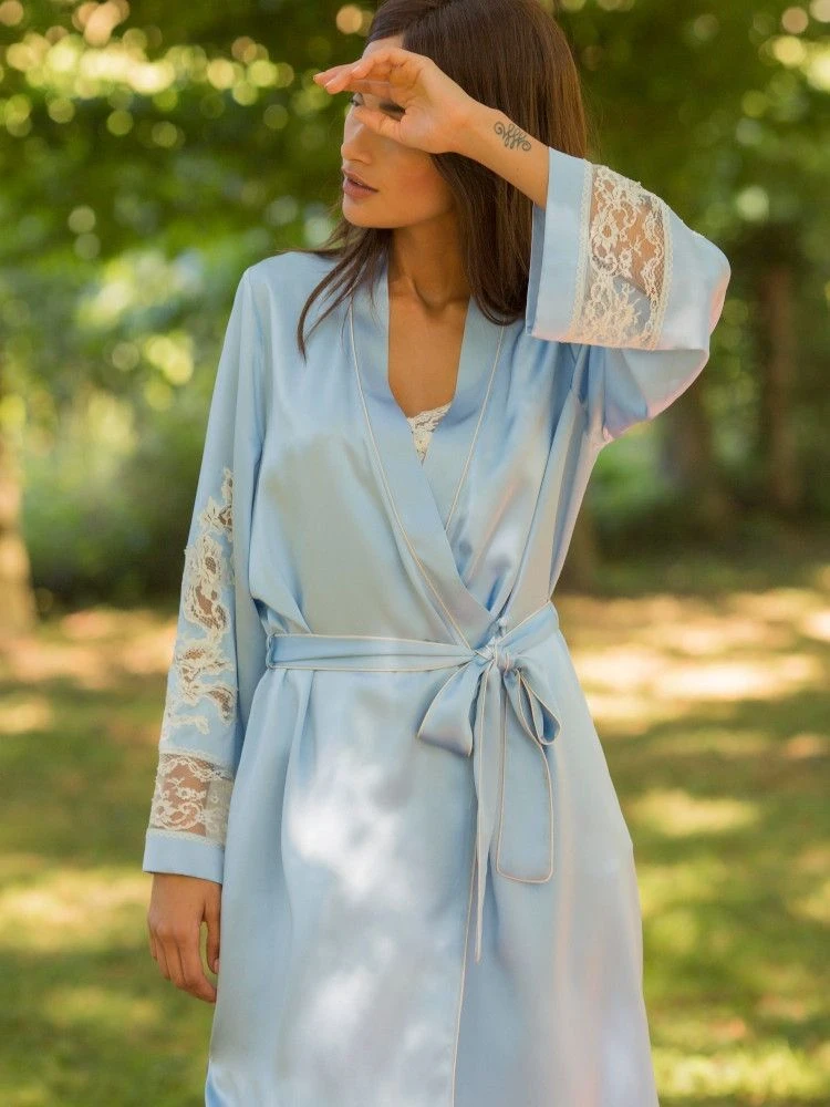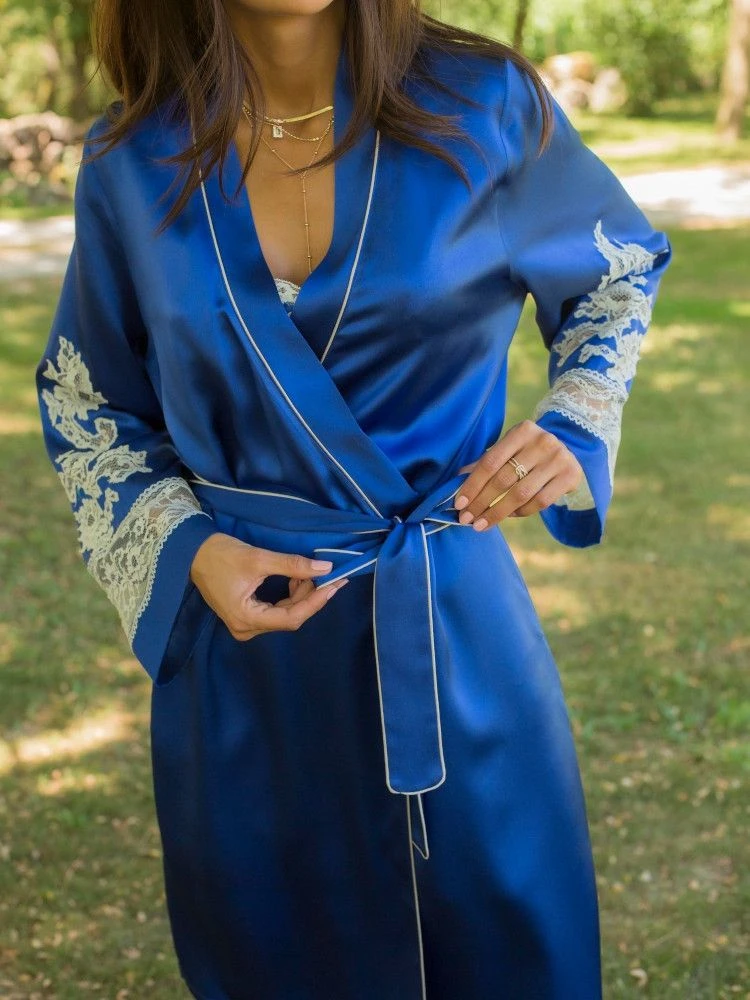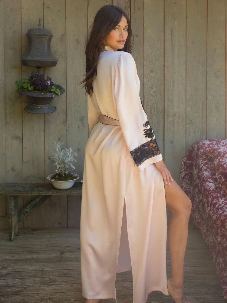 Die französische Caudry Spitze hat einen hohen Baumwollanteil von 76% und wurde auf auf beiden Ärmeln verwendet. Außerdem sind alle Kanten mit kontrastierenden Biesen abgesetzt. Seitlich ist dieser Kimonomantel hoch geschlitzt. Er wird gewickelt getragen und mit einem Bindegürtel geschlossen. Dieser lange Seiden-Morgenmantel ist ca. 135 cm lang und hat lange Ärmel.