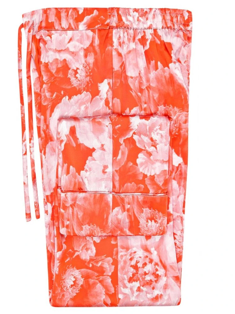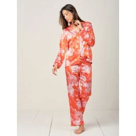Der Stoff ist mit einem großen Blumenmuster in cremeweiß auf korallerotem Hintergrund gestaltet. Dieser Seidenschlafanzug ist in den Größen XS bis L erhältlich. Das Oberteil ist geknöpft mit feinen Perlmuttknöpfen und hat lange Ärmel.