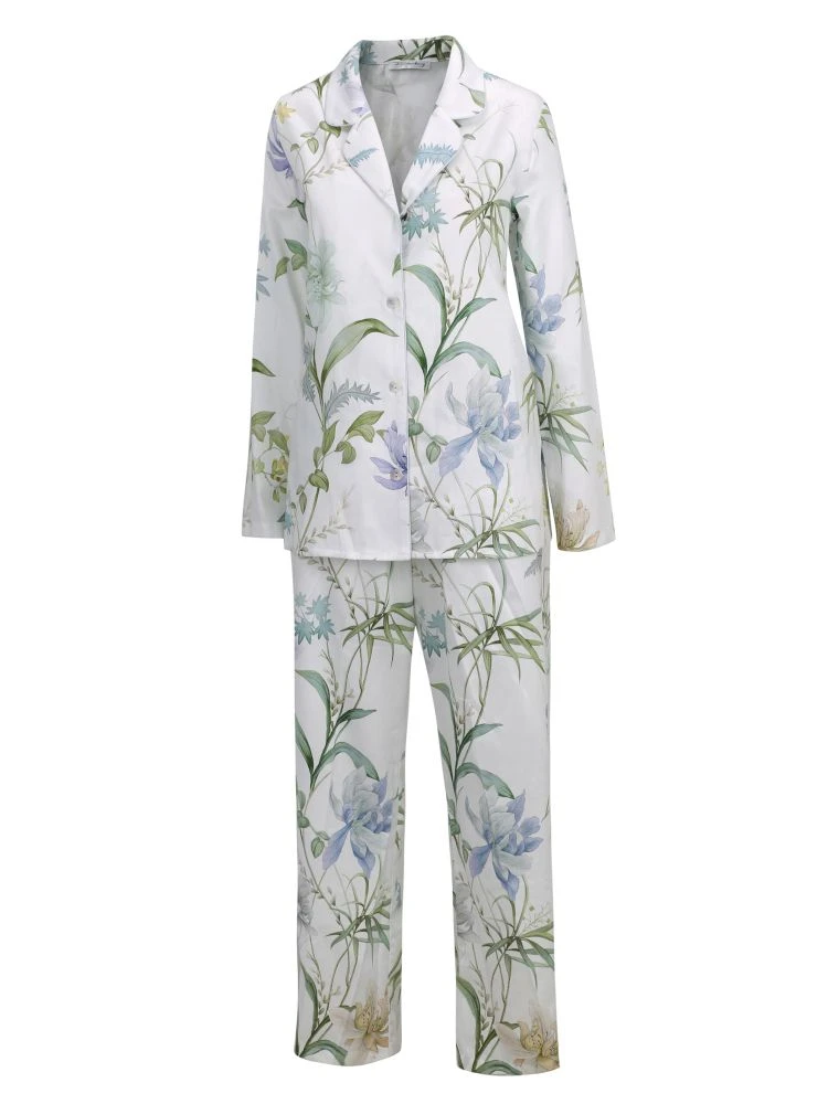 Dieser elegante Baumwolle Pyjama von Fürstenberg besteht aus sommerlichem Baumwoll-Satin aus mercerisierter, gezwirnter Mako-Baumwolle. Dieser elegante Damenpyjama hat einen verführerischen Blumendruck mit zarten Iris Blumen. Er ist mit einem Reverskragen ausgeführt, hat lange Ärmel und wird vorne durchgehend geknöpft mit Perlmuttknöpfen. Die lange Pyjamahose hat einen Gummibund und seitliche Taschen.