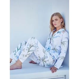 Der Schlafanzug in weiß mit zart grünem und blauem Druck ist feminin geschnitten und mit einer silbergrauen Biese verarbeitet. Er ist in den Größen 36 bis 46 erhältlich (deutsche Damen-Größen). Aus der gleichen Kollektion gibt es bei uns separat einen passenden Hausmantel.