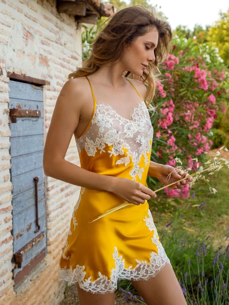Das kurze Spaghettiträger Neglige Nina der französischen Luxus Marke Marjolaine ist eine zauberhaft feminine Nachtwäsche. Der edle Stretch-Seidensatin aus 92% Seide und 8% Elasthan wurde mit zwei verschiedenen Arten von Spitze zu einer aufregenden Seidenwäsche verarbeitet. Durch den Elasthan Anteil im Gewebe wird die Passform verbessert.