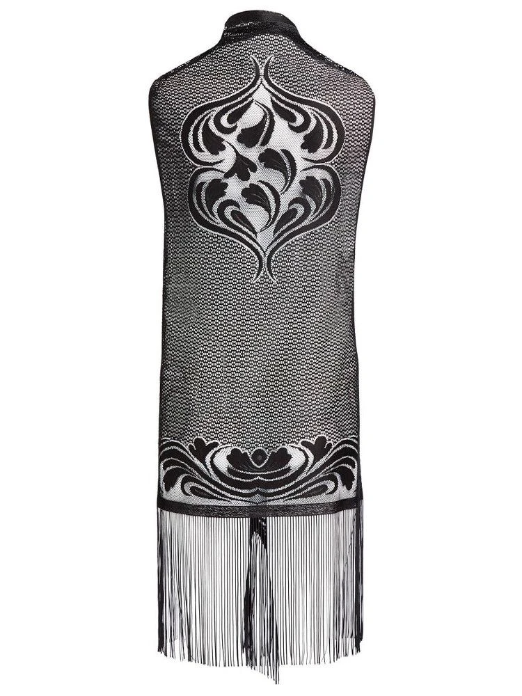 Diese Lang-Weste ist komplett aus weicher Häkelspitze gearbeitet. Sie wird gewickelt getragen und kann mit einem Bindebändchen geschlossen werden. Die Weste ist ärmellos und hat einen langen Fransensaum. Sie ist vielfältig zu Dessous, als Homewear oder Strandkleidung kombinierbar.