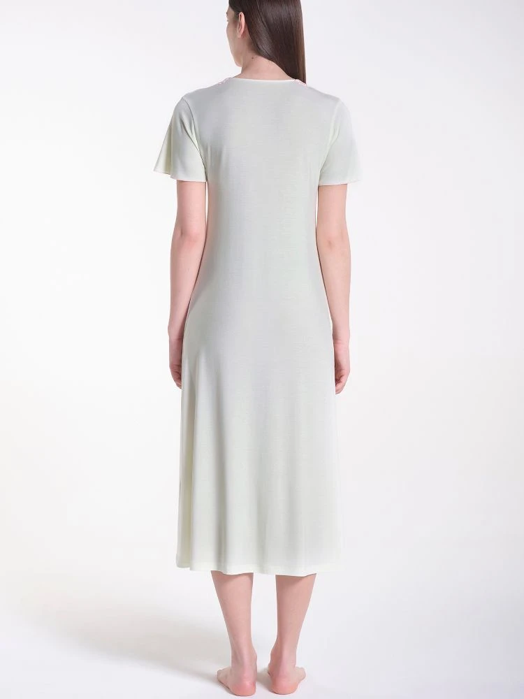 Dieses elegante, lange Nachtkleid ist bei uns in zartgrün mit rosa erhältlich.