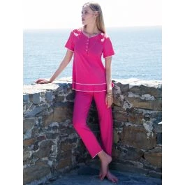 Der Kurzarm Damen-Pyjama von Chiara Fiorini besteht aus superweichem Micro-Modal in einer hautsympathischen, elastischen Jersey-Qualität (95% Modal, 5% Elasthan). Er ist Made in Italy und in den Größen 36 bis 44 erhältlich. Dieser Pyjama hat ein ca. 68 cm langes Oberteil mit kurzen Ärmeln. Im unteren Teil ist das Oberteil mit einem breiten Saum abgesetzt. Der Ausschnitt hat eine kurze Knopfleiste mit Perlmutt Knöpfen. Das Oberteil ist oben seitlich mit Blütenspitze im Makramee-Look verziert. Die kurzen Ärmel, der Ausschnitt und die Beinenden sind in Kontrastfarbe gekettelt. Die Hose hat gerade Beine und einen Gummibund.