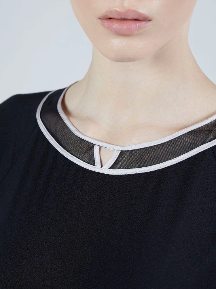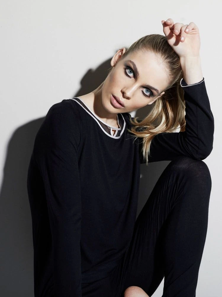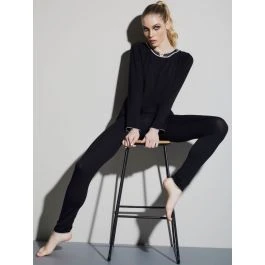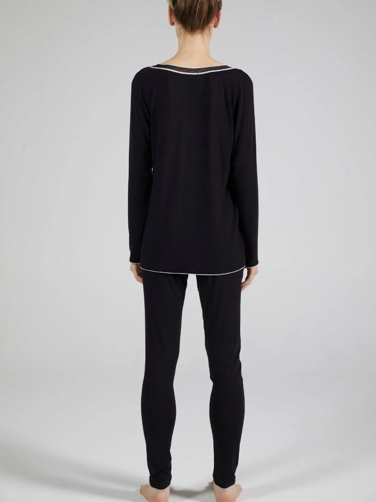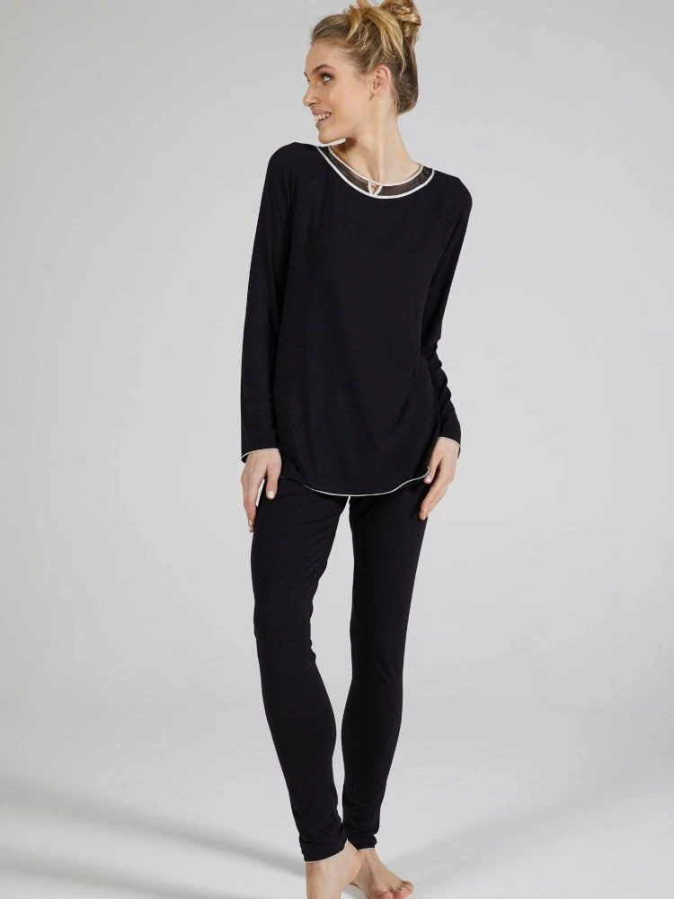 Der lange Pyjama von Verdiani Weekend besteht aus weichem Micro-Modal in einer hautsympathischen, elastischen Jersey-Qualität (92% Modal, 8% Elasthan). Er ist Made in Italy und in den Größen 36 bis 44 erhältlich. Der Damen Pyjama hat lange Ärmel und einen runden Ausschnitt. Der Ausschnitt ist mit puderfarbenem Satin eingefasst und hat eine Verzierung aus schwarzem Tüll. Das Oberteil ist ca. 65 cm lang und die lange Hose hat einen Gummibund.