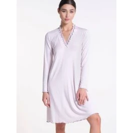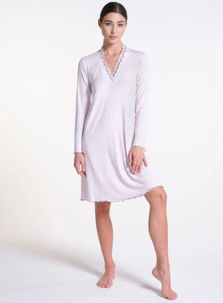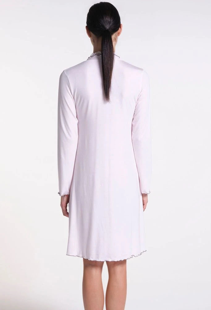 Dieses elegante, knielange Sleepshirt ist bei uns in der Herstellerfarbe „angel 30“ zartrosa mit grauen Kontrasten erhältlich.