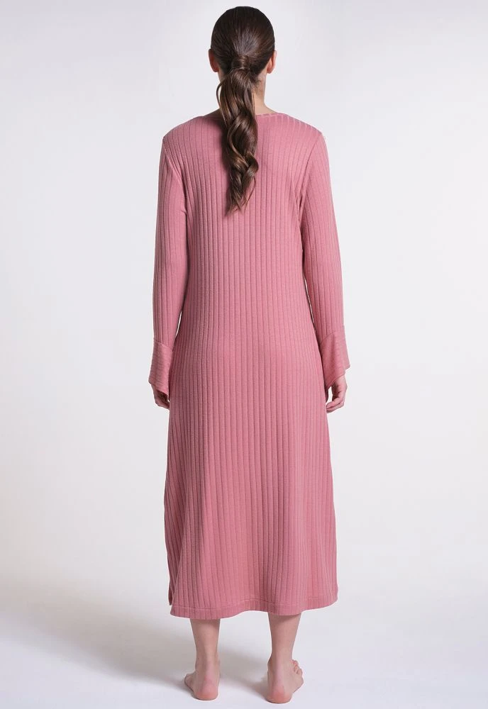 Das Lounge-Kleid hat lange Ärmel, die am Ende weit geschnitten und geschlitzt sind und ist ca. 125 cm lang. Es ist eine bequeme Loungewear für jede Jahreszeit kann aber auch als Tagbekleidung in verschiedenen Kombinationen getragen werden. Da es nicht gefüttert ist, kann es auch als Nachthemd verwendet werden. Das Kleid ist bei uns in der Farbe Phard Altrosé erhältlich.