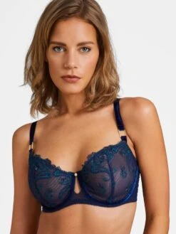 Der Triangel BH Sin ist eine luxuriöse Lingerie der französischen Edel-Dessous Marke Maison Lejaby. Der BH hat Cups in Triangel Form, die bei dieser Marke als Vollschale bezeichnet werden. Die Cups mit Bügel sind aus bestickter Tüll-Spitze mit floralen Motiven gearbeitet. Die Cups sind ungefüttert und transparent.