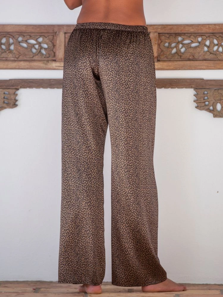 Die lange Pyjamahose Omaya der französischen Luxus-Marke Marjolaine ist aus glänzendem Seidensatin (Stretchseide mit 92% Seide, 8% Elasthan) gefertigt. Das edle Material fällt weich und fließend und ist angenehm auf der Haut. Der Satinstoff glänzt elegant und hat ein kleines Allover Animal Print Panther Muster.